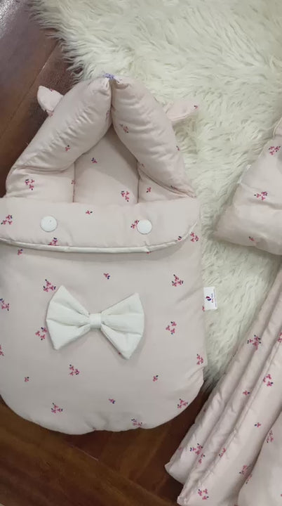 Give your little princess the gift of comfort and style with the Baby 8 Pieces Bed Set in Pink Flower design. This beautifully coordinated set is thoughtfully designed to offer warmth, protection, and softness for your newborn. Whether at home or on the go, it’s the perfect all-in-one solution for safe, cozy sleep.