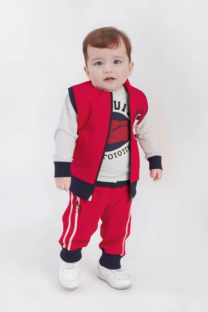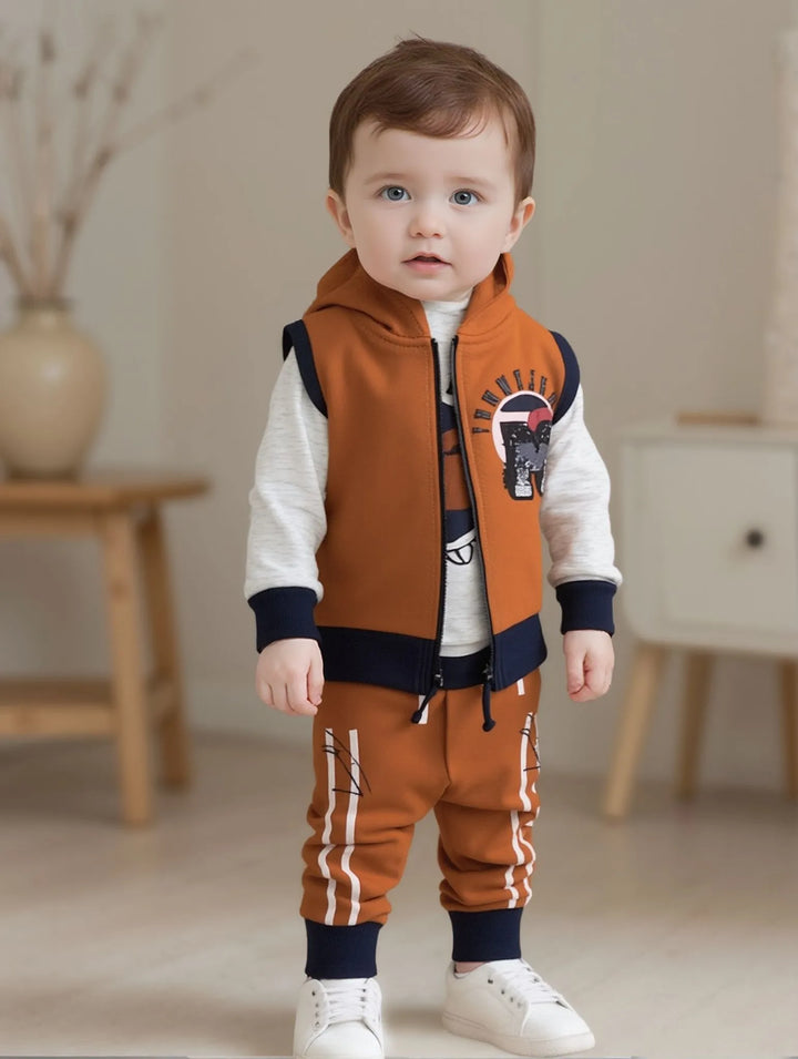 Keep your little champ cozy and stylish with this Baby Boy 3-Piece Hooded Track Suit, designed for both comfort and fashion. The set includes a soft inner shirt, a sleeveless sando hoodie, and a matching trouser — making it a complete and trendy outfit for every season.