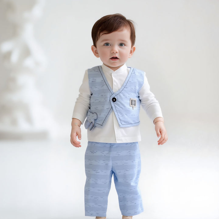 Dress your baby boy in cozy style with this Infant 3-Piece Suit Set, designed for comfort, cuteness, and daily wear. This essential baby outfit includes a soft shirt, matching trouser, and a snug cap — making it a perfect set for newborns and infants.